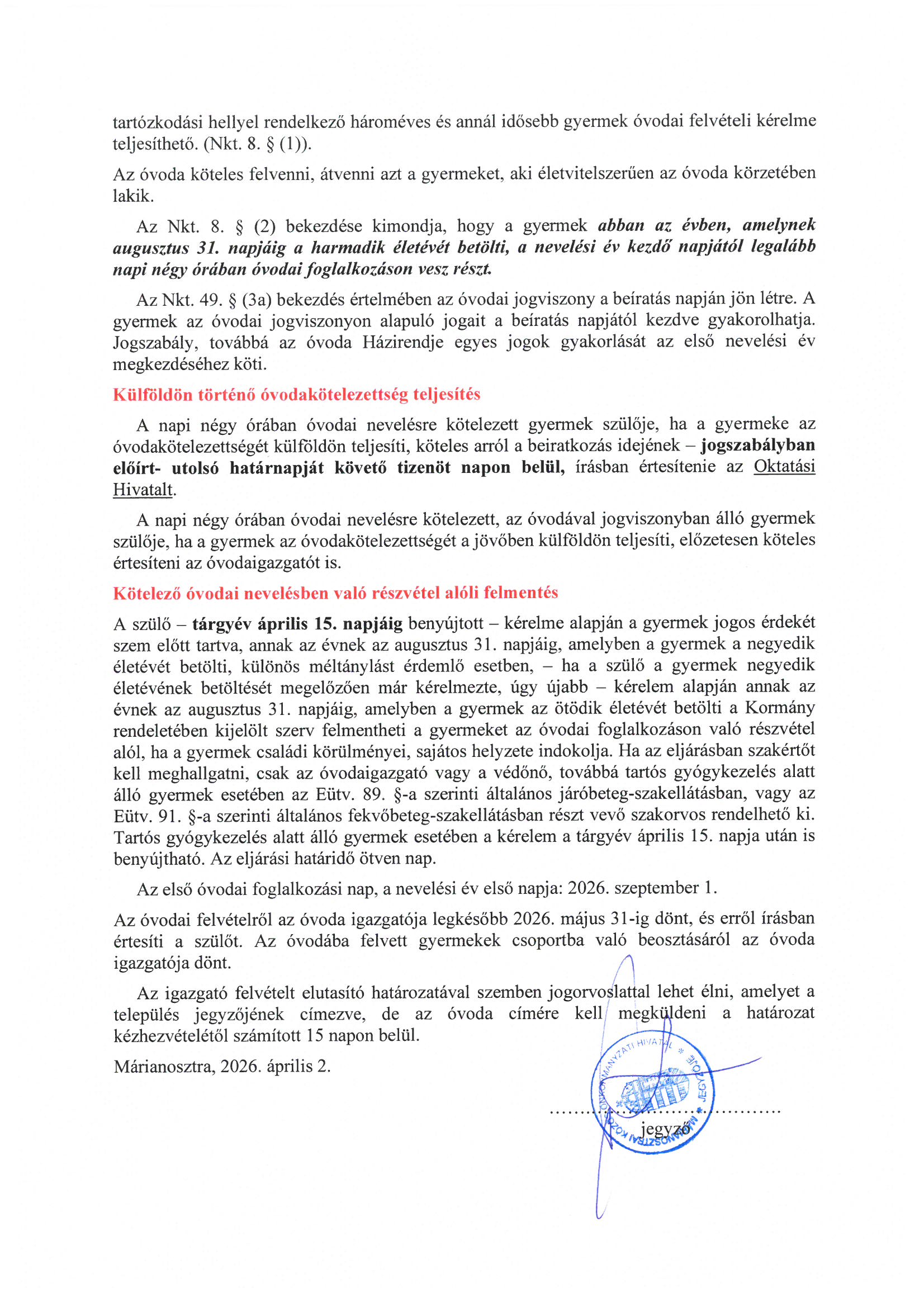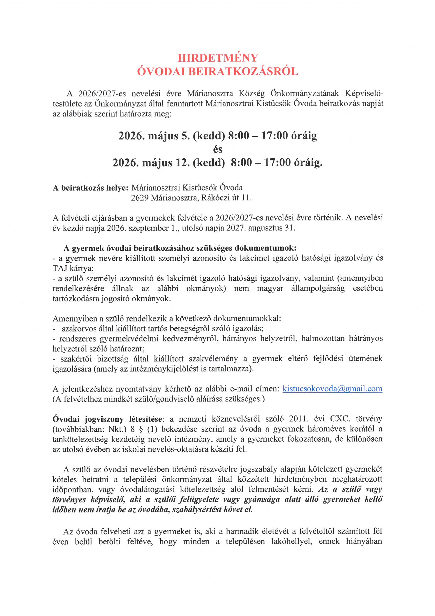 Hirdetmény óvodai beiratkozásról