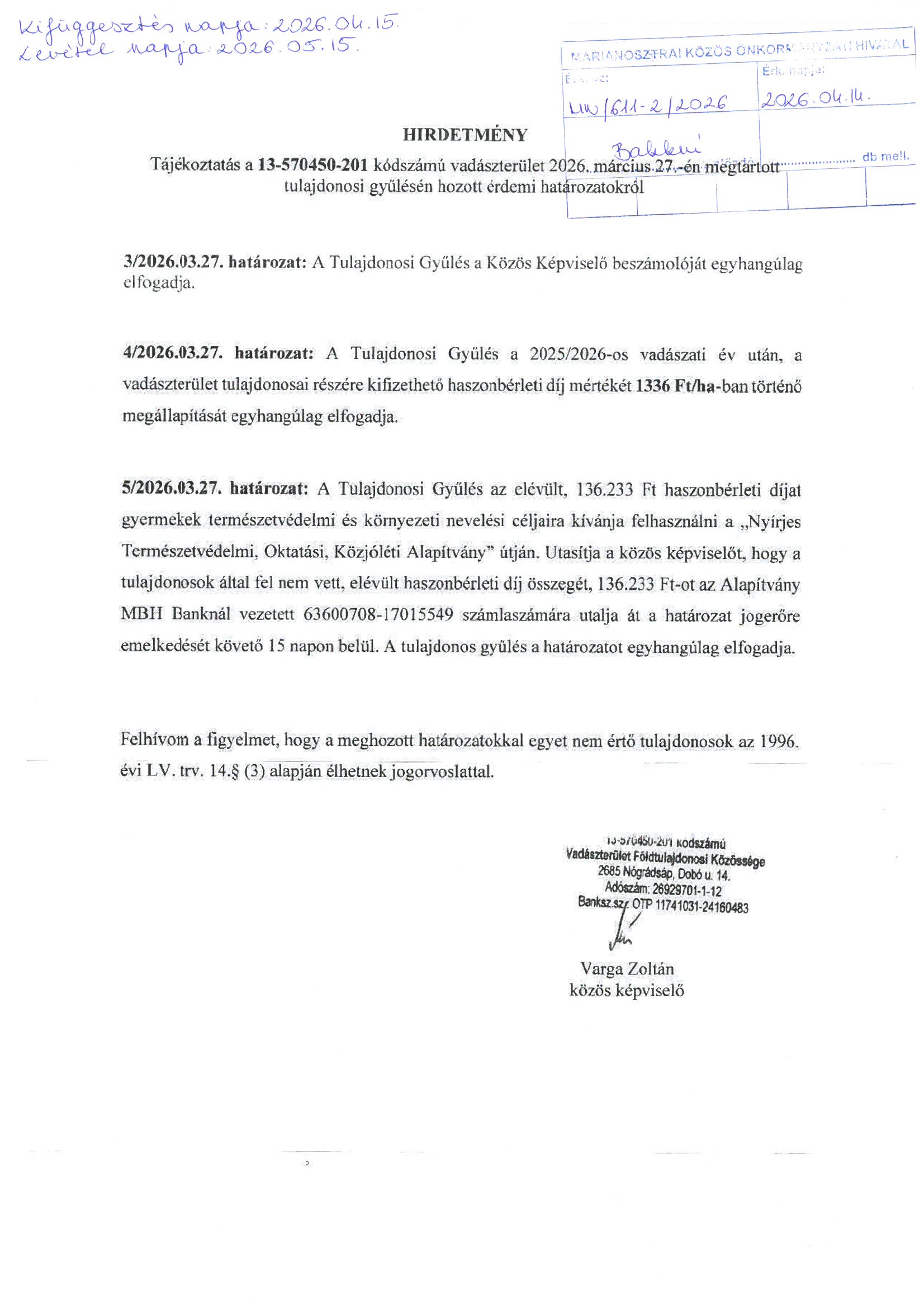 HIRDETMÉNY – Tájékoztatás a 13-570450-201 kódszámú vadászterület 2026. március 27.-én megtartott tulajdonosi gyűlésén hozott érdemi határozatokról